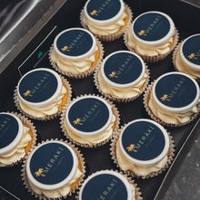Each cupcake is freshly baked and topped with a high-quality edible logo backed on fondant, creating a crisp and professional branded finish.